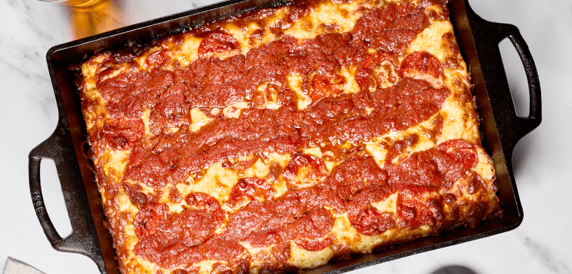 The Detroit style pizza is a deep-dish pizza made in a rectangle steel pan and then cut into squares. The dough has a unusually...